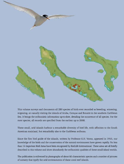| Checklist of the birds of Aruba, Curacao and Bonaire, South Carribbean Prins T.G., Reuter J.H., Debrot A.O., Wattel J. & Nijman V. 2009. Checklist of the birds of Aruba, Curaçao and Bonaire, South Caribbean. Ardea 97(2): 137–268. This volume surveys and documents all 280 species of birds ever recorded as breeding, wintering, migrating, or casually visiting the islands of Aruba, Curaçao and Bonaire in the southern Caribbean Sea. It brings the avifaunistic information up-to-date, detailing the occurrence of all species. For the rarer species, all records are specified from the earliest up to 2008. These small, arid islands harbour a remarkable diversity of bird life, with affinities to the South American mainland, but remarkably also to the Caribbean avifauna. Since the first bird guide of the islands, written by Professor K.H. Voous, appeared in 1955, our knowledge of the birds and the conservation of the natural environment have grown rapidly. No less than 15 Important Bird Areas have been recognised by BirdLife International. These areas are all briefly described in this volume and show abundantly the avifaunistic qualities of these small island worlds.